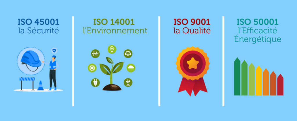 Pour harmoniser et optimiser les pratiques au quotidien, les entreprises se dotent d’un Système de Management Intégré (SMI) qui s’articule autour de 4 normes ISO de référence :