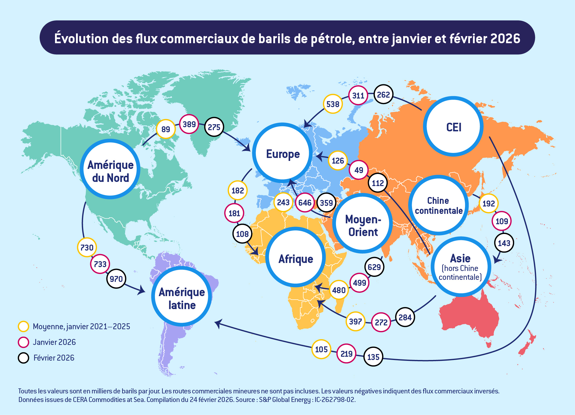 Cette dépendance rend notre approvisionnement particulièrement sensible aux perturbations actuelles, d’autant que les alternatives sont actuellement contraintes : les pays asiatiques ont suspendu leurs exportations de produits finis et les États-Unis, confrontés à un hiver particulièrement rigoureux, privilégient leur marché domestique. En conséquence, avec près d’un cinquième de la production mondiale de pétrole (brut et gazole) bloquée à Ormuz, les tensions d’approvisionnement ont provoqué une envolée des cotations, se traduisant respectivement par une hausse de 30 centimes par litre pour les essences et de 60 centimes pour le Diesel.