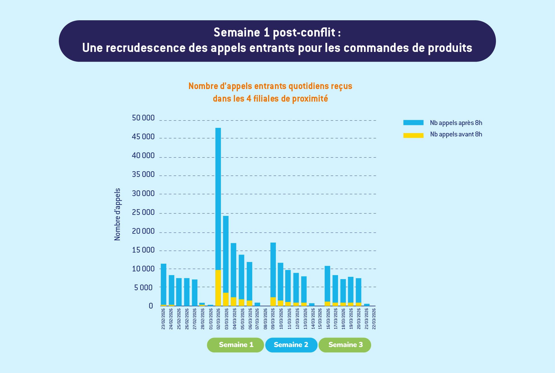 Virginie MERINI : Les semaines qui ont suivi le déclenchement du conflit au Moyen-Orient ont été vécues très différemment par les équipes. Nos clients professionnels, fortement dépendants du gazole et du gaz naturel non routier (GNR), ont immédiatement réagi à cette flambée des prix. Cette tension a généré un pic inédit de commandes : le 2 mars, nos quatre filiales de proximité ont reçu près de 50 000 appels, alors que la moyenne en février tournait autour de 8 000 appels par jour… En conséquence, notre organisation logistique n’a pas pu absorber une telle explosion de demande, ce qui s’est traduit par un allongement des délais de livraison.