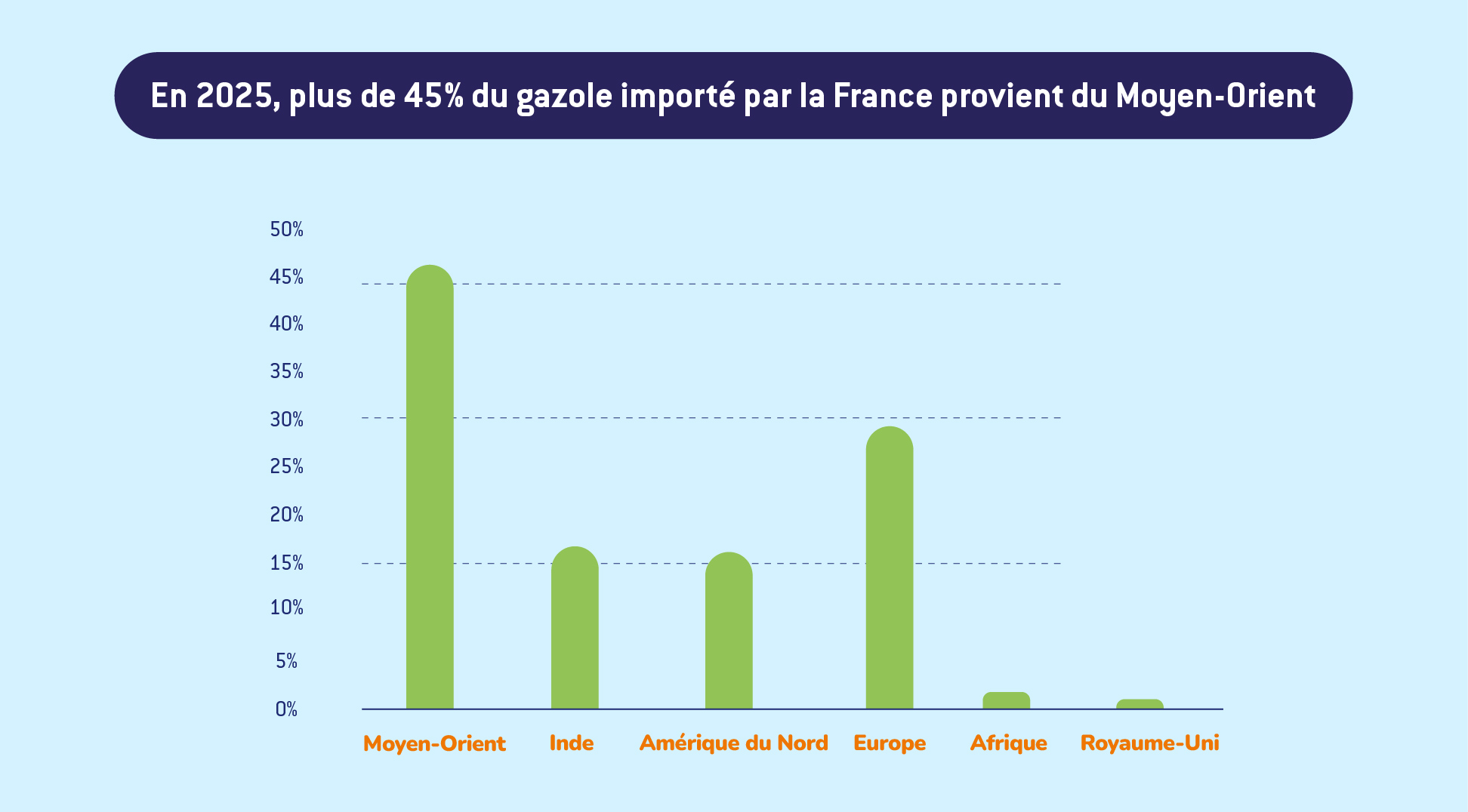 Lucile LOISEAU-BADAIRE : Pour comprendre les effets de ce conflit sur nos activités, il est important d’avoir en tête la dépendance européenne et française aux importations de produits pétroliers en provenance du Moyen-Orient, en particulier pour le gazole. Si cette région joue un rôle limité pour nos approvisionnements en essence, elle est devenue centrale pour le gazole depuis l’instauration des sanctions commerciales à l’encontre de la Russie à la suite de son intervention en Ukraine. Le Moyen-Orient est désormais le premier fournisseur de gazole de l’Europe et représente à lui seul un tiers des importations. En France, un quart du gazole distribué dans nos stations provient de cette région.