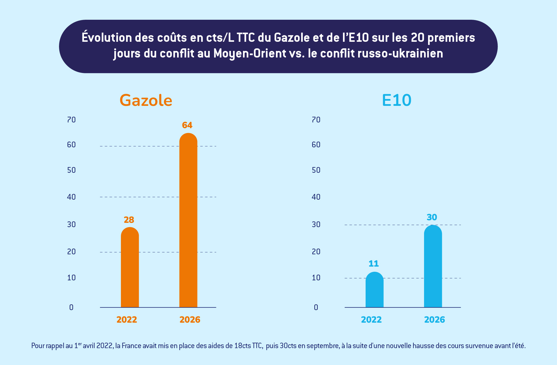 Pour répondre précisément, nous constatons que l’augmentation des prix à la pompe est deux fois plus forte – et bien plus rapide – que celle connue en 2022. À l’époque, le prix de l’essence enregistrait une hausse cumulée de 11 centimes par litre, contre 30 centimes aujourd’hui. De la même manière, le Diesel connait désormais une hausse cumulée de 64 centimes par litre, qui contraste nettement avec celle de 28 centimes observée en 2022.