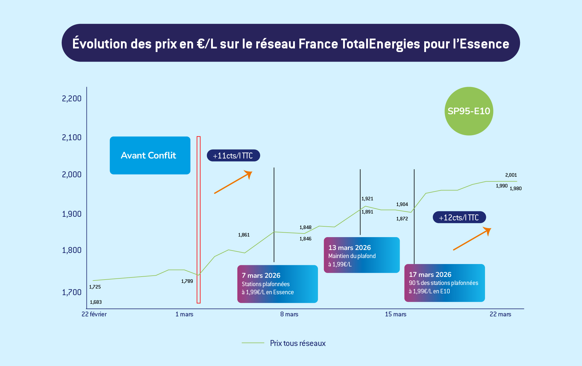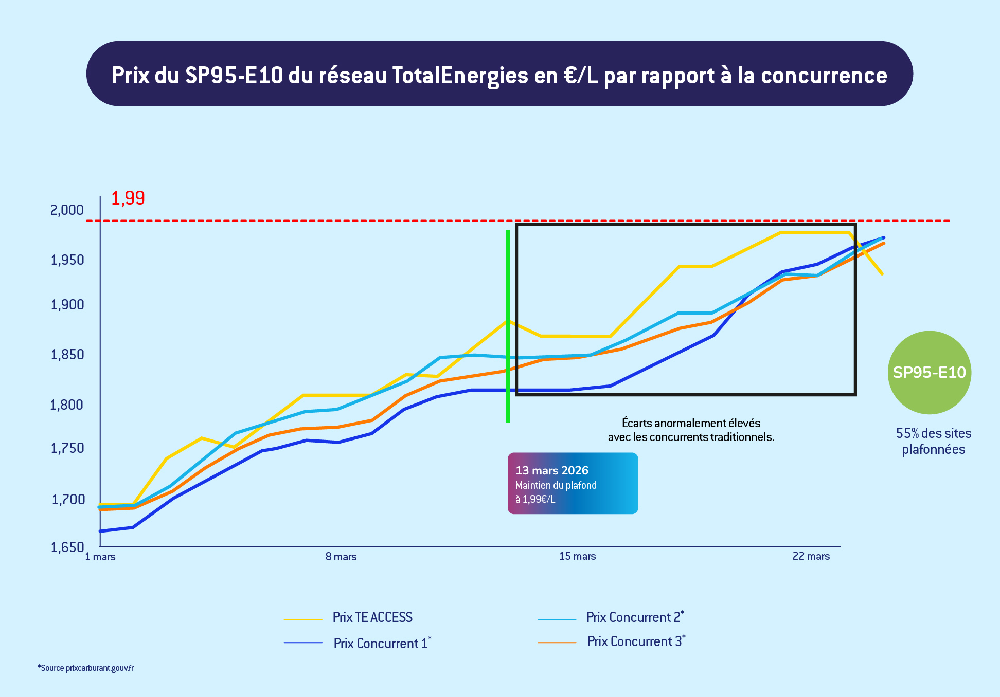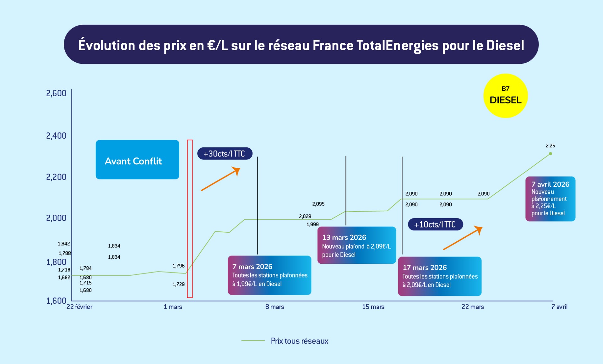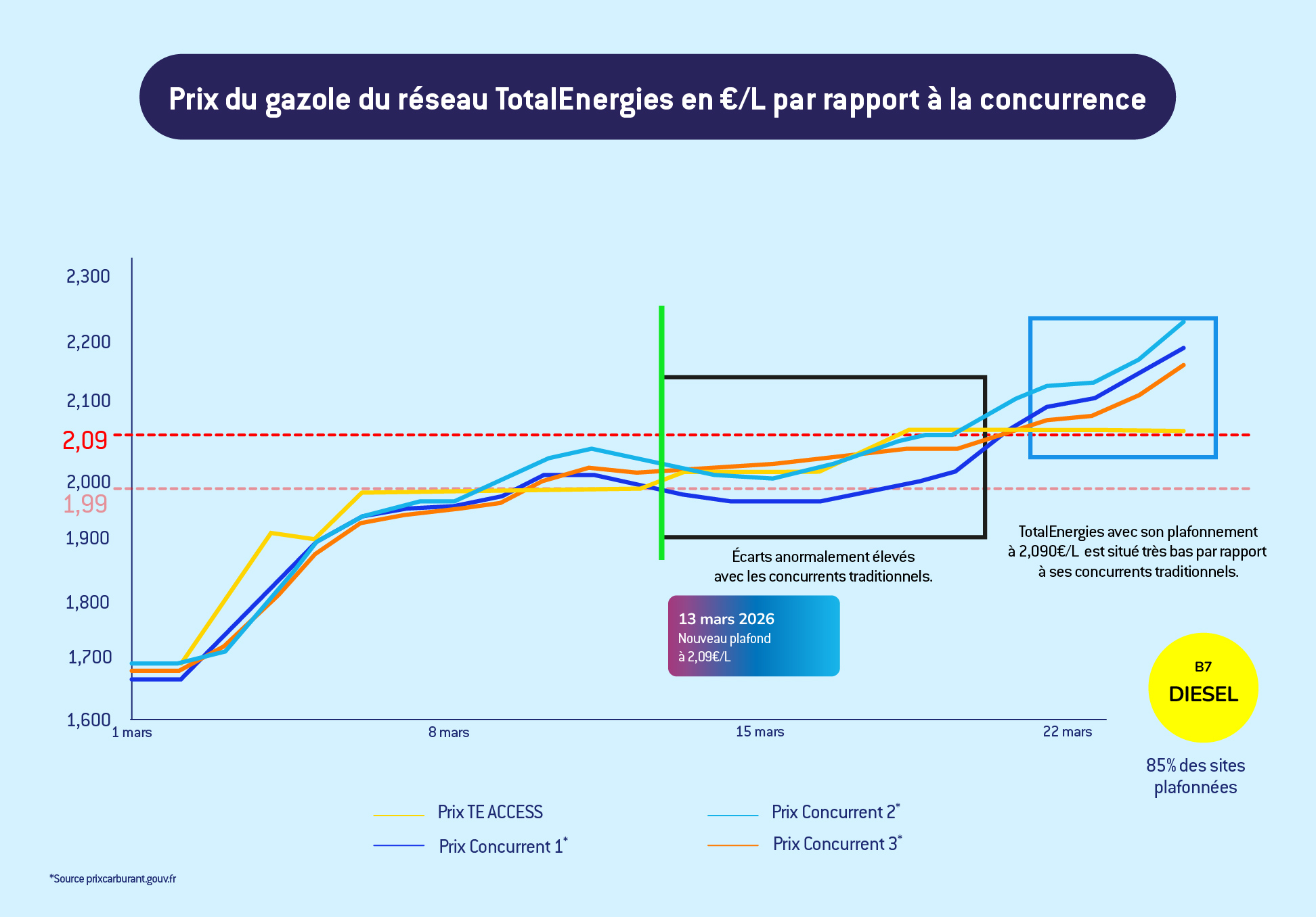Pour préserver le pouvoir d’achat des automobilistes, TotalEnergies a instauré le 13 mars, sur l’ensemble du réseau en France, un prix-plafond de 1,99 €/L pour les essences et de 2,09€/L pour le Diesel, qui a été réajusté à 2,25€/L le 7 avril suite aux très fortes hausses des cotations Diesel au mois de mars. Parallèlement, les clients particuliers électricité et gaz et membres du Club, bénéficient d’un plafond à 1,99 €/L, valable sur tous les carburants et sur toute l’année 2026.