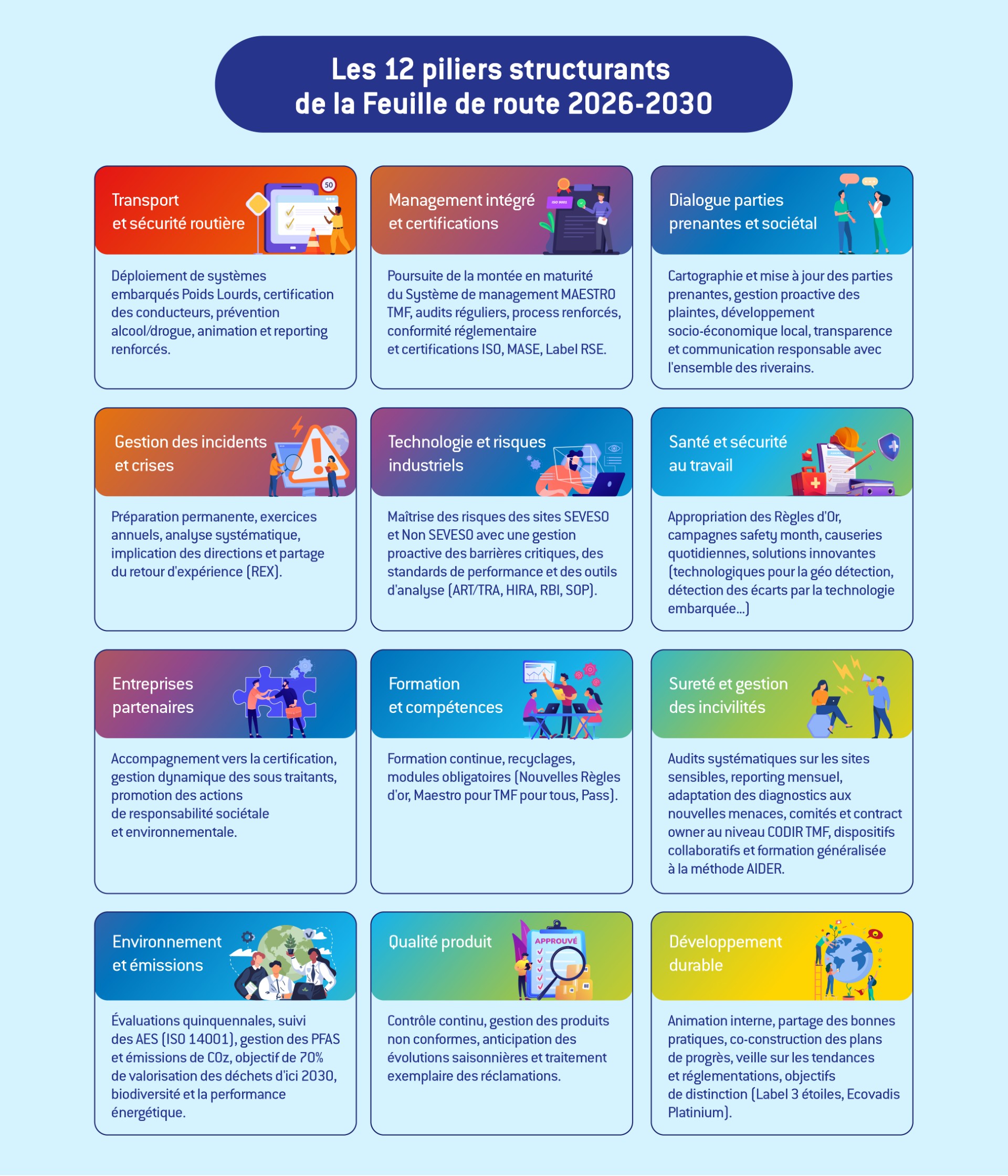 Anne-Sophie MIEL : La Feuille de route 2026-2030 s’articule autour de trois grandes ambitions. La première vise à travailler sur la valeur Sécurité au plus proche des réalités des collaborateurs. Nous voulons également encourager l’innovation, tout en développant la responsabilité et la reconnaissance de chacun. Enfin, cette Feuille de route porte une ambition forte de mobilisation de toutes nos parties prenantes : compagnons et entreprises extérieures, conducteurs et transporteurs, gérants et commerces…