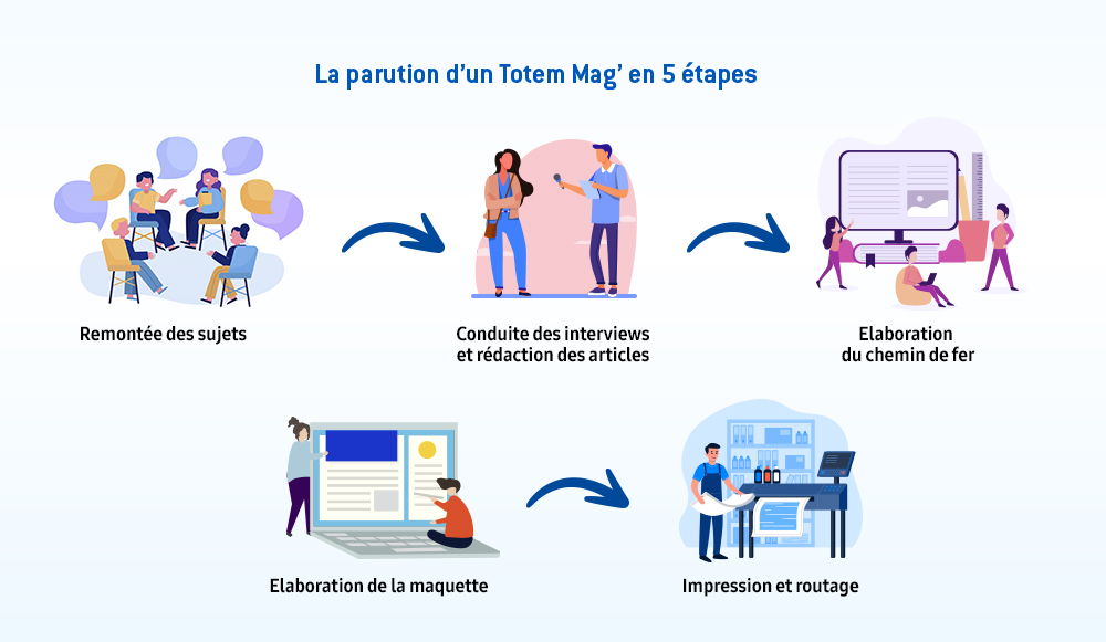 N.M : De la page blanche à la réception du Totem Mag’ en station, il faut compter 4 mois. Tout commence avec la remontée des sujets, orchestrée lors d’un comité éditorial que j’anime, réunissant les différents métiers du Réseau. En parallèle, les chefs de secteur, en contact direct avec les exploitants, me transmettent leurs propositions.
