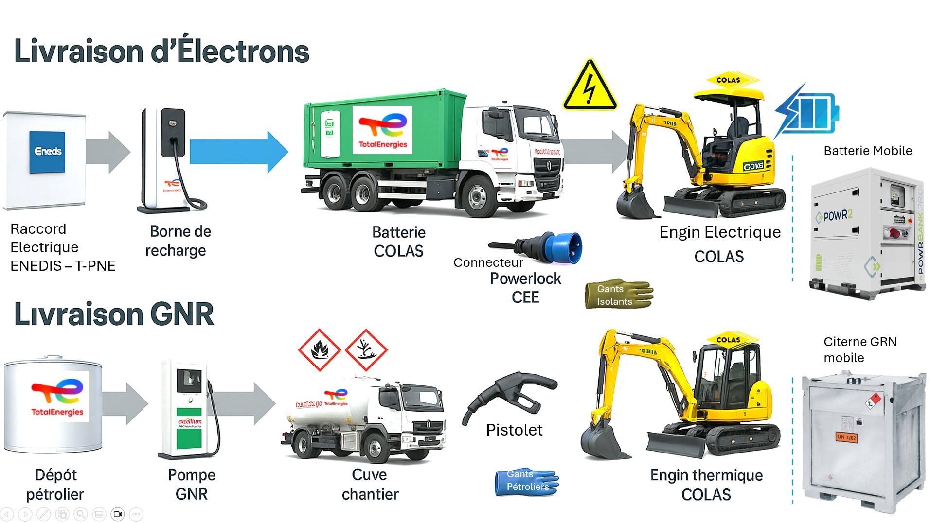 « Nous accompagnons les entreprises de Travaux Publics dans leur transition énergétique, en participant activement à une première opérationnelle innovante de livraison d’électrons sur le chantier de Roissy aux côtés de Colas.